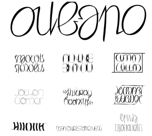 Ambigrama, por Lécroart, com nome dos primeiros oubapianos. Você pode girar a página a 180º e consegue ler os mesmos nomes!
