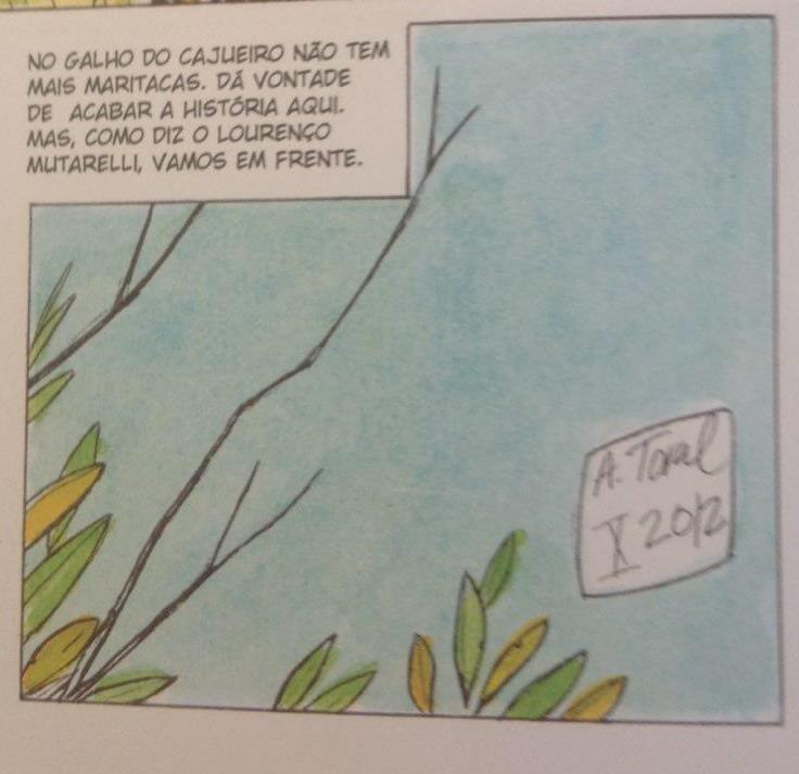 A arte do Toral é de poucos detalhes nas linhas, mas não se aproxima do cartunesco. Mesmo o cenário é desenhado com precisão ainda que com economia de traço. É como se o desenho fosse o esqueleto da cor aquarelada que ele usa. A cor me ajuda a defender esse ambiente fantástico que disse antes também – várias vezes o fundo dos quadros são apenas cores, mas em vez do chapado da Turma da Mônica (por exemplo), é aquarela.