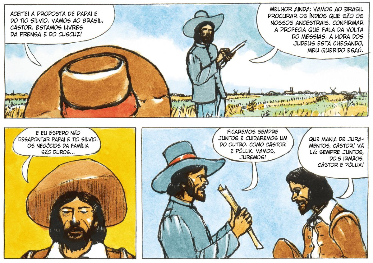 Do ponto de vista do enquadramento, Toral engalfinha a história nos gêmeos Cástor e Esau (pirei horas com a mistura dos pares Esaú-Jacó e Cástor-Pólux), recorrendo então a planos aproximados dos personagens e quadros abertos pra posicioná-los em relação ao cenário. Quando o autor opta por não mostrar os personagens, há cenas lindas como os patos na lago na primeira história ou os pássaros sobre o mar na segunda.