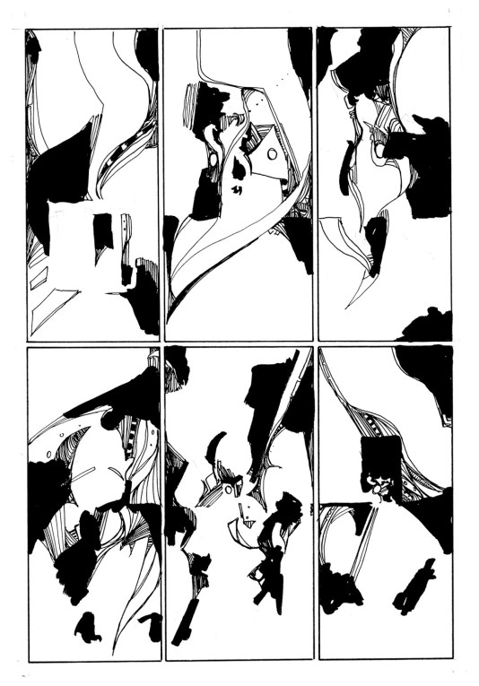 Pois é, a proposta agora é mudar o olhar sobre o que seria o abstrato nessa mídia/linguagem específica e Baetens joga suas fichas que a abstração nos quadrinhos seria a “não narratividade”. Eu parafraseio, mas um tantico acrescento aqui: elementos não figurativos assumem características narrativas pela justaposição com os demais elementos da página e da montagem da página em que estão com as demais páginas da história.