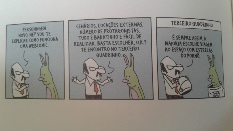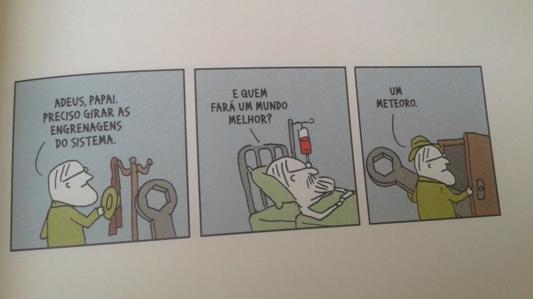 André Dahmer já havia sido indicado ao Prêmio Jabuti de Ilustração em 2015, por Vida e obra de Terêncio Horto, da Cia das Letras. É até engraçado, e essa indicação é um grande exemplo da necessidade de uma categoria própria de quadrinhos: o livro inteiro composto de praticamente apenas três desenhos concorrendo entre ilustrações rebuscadas de livros variados? Não é preciso justificar o valor do trabalho de Dahmer, é sabido o quanto a força dele reside no minimalismo do desenho confrontado com o texto absurdo – no sentido absurdo da realidade absurda em que vivemos, bem Beckett, Ionesco, mesmo. Mas essa força do contraste, pelo nó, é uma característica da mídia dos quadrinhos em si, que se vale da justaposição dos elementos.