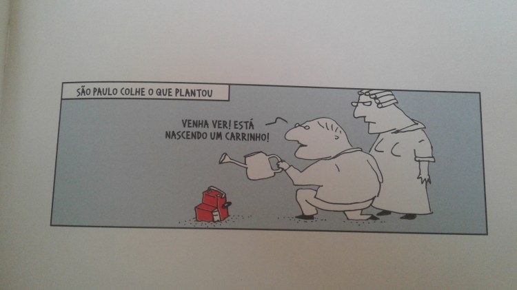 É a série mais metalinguística de Dahmer, que após quase dez anos vivendo em caixinhas virtuais, conhece muito bem esse mundo, e suas tiras pessimistas ainda ajudam a rir e a chorar de tudo. Uma das primeiras tiras da série, sobre “conteúdo na internet”, ridiculariza a produção em massa de informação desnecessária. O final do livro tem as tiras mais poeminhas (a tira pro Dahmer é um haikai, ele já disse), como a que contrasta “a banana do seu neto/a laranja da sua esposa/o amigo do seu filho” com produtos embalados e o evidente celular, ou “na casa do vovô ainda tem telefone fixo/tocador de CD/televisão”. Ou a ilustração das redes sociais Tinder, Twitter e Facebook, que viram estabelecimentos diferentes (um motel, um hotel e uma pousadinha) no desenho. Ali, há a habilidade do desenho que se soma ao texto mínimo. As metáforas desenhadas, como o carrinho nascendo de São Paulo, o homem que quer consertar o mundo com uma chave de boca gigante, ou os diabinhos nos cubículos do inferno, são imagens extremamente potentes com textos que às vezes até desaparecem no colorido delicado, no traço mínimo, mesmo se a tipografia nova da série é bem mais marcada que a tradicional Verdana. Contando esse passado presente dos anos 10, André Dahmer optou por um desenho mais palatável que os tracinhos crus do malvadinho. Assim como a internet nos faz engolir muito mais sapos cotidianos quando eles vêm acompanhados de gatinhos.