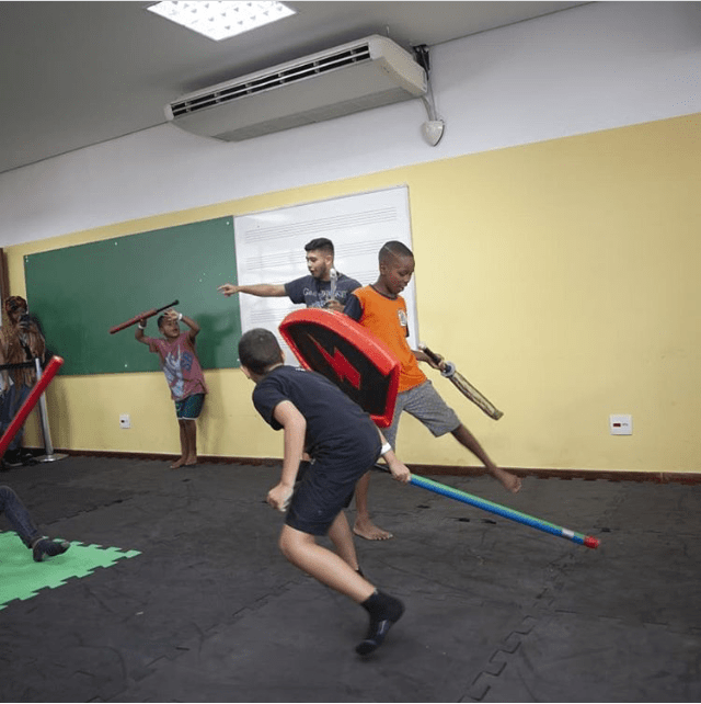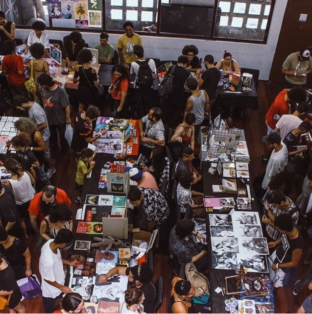 Não tenho como explicar isso. Só posso dizer que essa galera tem discurso muito diferente do discurso da minha quebrada, que fica, como disse no início, no centro do privilégio. Aqui ou carinha é reaça mesmo e faz luzes quinzenalmente, ou é de esquerda e passa o dia martelando lamentos pesados nas redes sociais. Eu sou do segundo time, mas desde o início avisei aos editores do Balbúrdia que não poderia escrever um texto sobre o evento porque não tinha visto nem a galeria dos artistas. Mas daí, enquanto escutava seu apelo de que fosse um texto pessoal e tals, fiquei pensando que talvez devesse escrever nem que fosse para contar que, num domingo de sol de 2019, esses caras conseguiram ocupar um centro cultural no Capão Redondo com quatro mil pessoas que passaram o dia celebrando a alegria de jogar, desenhar, conversar, ver o trabalho de artistas independentes, ouvir a galera debater assuntos diversos e passear de lá pra cá exibindo fantasias.