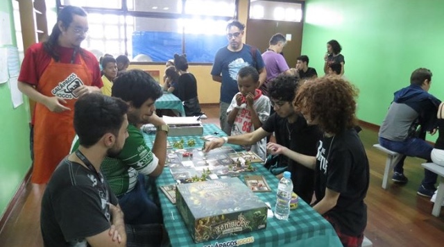 O lugar estava lotado, com fila pra tudo. Mas até a hora de ir embora, quando descobri no final que muita gente não tinha conseguido entrar depois de passar duas horas na fila, por causa da lotação, lá dentro o clima era de celebração e alegria geral. Passei rapidamente pela biblioteca, cheia de adultos e adolescentes jogando RPG nas mesas e crianças brincando de uma luta altamente ritualizada com espadas de papel (algum jogo que deve ter nome conhecidíssimo que desconheço). Nos corredores, muitos jovens, crianças e cosplayers andando de um lado pro outro.