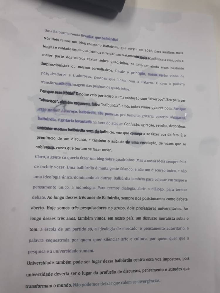 Teve na abertura um momentinho em que Maria Clara e eu optamos por ler um texto sobre a CRIMINALIZAÇÃO da balbúrdia na universidade. Nós defendemos que balburdiar é massa (e vale lembrar que esse espaço já estava aqui antes da palavra virar modinha). A imagem do texto segue abaixo, meio borrada por água, que deixa ela menos legível, porém mais bonitinha: