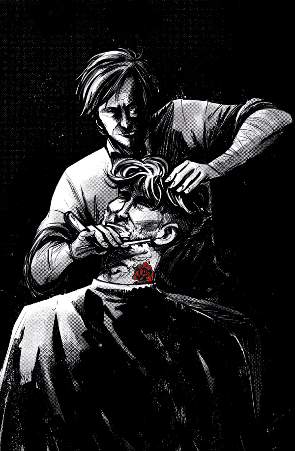 A trama é um cliente que chega na barbearia quando ela está fechando; insiste e é atendido. Quando ele está sentado na cadeira, o barbeiro vê a tatuagem no pescoço dele, a rosa vermelha, o que desencadeia a memória (e o flashback). Sem querer dar muitos detalhes, acho essa parte que mostra a motivação da história, o ponto baixo da narrativa (se trata de algo já visto tantas vezes, que me parece gasto e dá uma patinada no todo).
