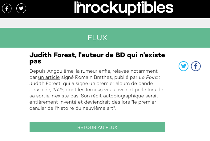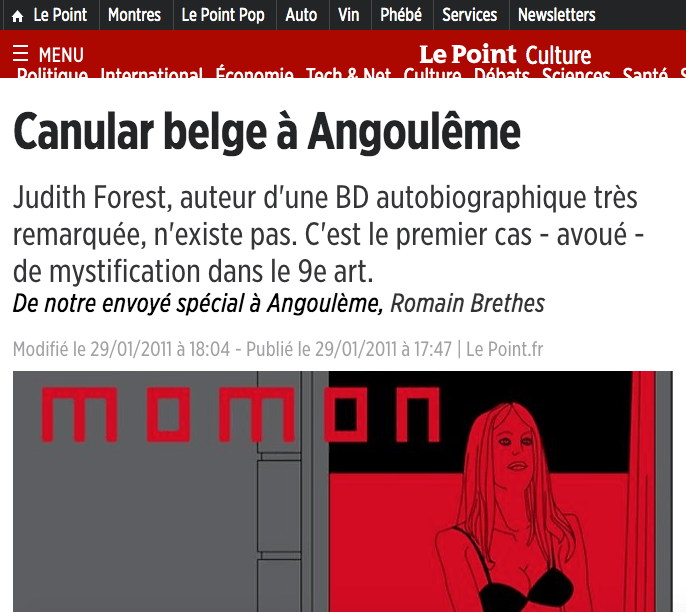 Porém, Judith Forest não existe, de verdade. Nem Cecilia dos Santos, nem Momon (que ainda são citados nos agradecimentos de 1h25). A Wikipédia nos dá ano e região de nascimento, e aborda o rumor dela ser criação dos autores e seus editores Xavier Löwenthal, William Henne e Thomas Boivin. E eles não enganaram apenas a imprensa especializada em quadrinhos. Les Inrockutibles, revista pop do mundo audiovisual francês, ou a revista generalista Le Point: todos foram surpreendidos. Uma pegadinha tremenda, em um momento em que a internet já corria de vento em popa e os rumores poderiam ser facilmente desmontados, a farsa só foi descoberta após a publicação de sua segunda obra: eles tinham contratado uma atriz para dar entrevistas e autografar livros nos festivais para reforçar a suposta autenticidade de uma autobiografia tão íntima e reveladora.
