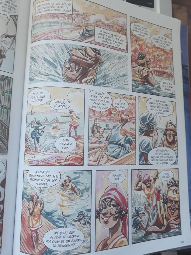 Koehler é conhecida pelo seu traço elegante, seu apuro na pesquisa de imagens de época, e nos entrega esse quadrinho bonito, que nos permite questionar o racismo implícito na construção de uma cidade. A história conta a trajetória de quatro jovens, um casal negro (Vitória e Francisco) e um irmãos de rica família alemã (Teo e Frederica). A jovem negra, Vitória, era filha de uma professora, que ensinava português ao pequeno alemão Teo: um entrecruzamento entre grupos sociais distintos que se conhecem pelas letras, pelo trabalho.