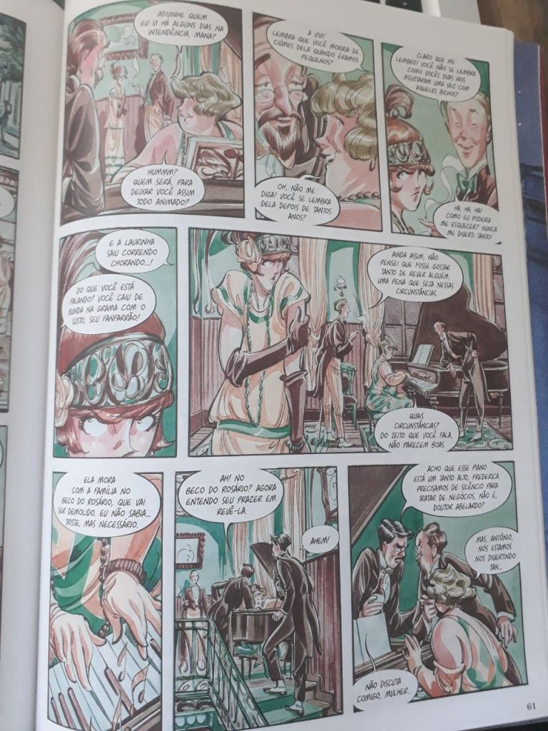 E é por questões de trabalho que voltariam a se cruzar, mais tarde, porém em relações distintas: enquanto o jovem alemão se tornaria um dos engenheiros responsáveis pela reforma da cidade, a filha da professora fazia parte do grupo de pessoas que seriam retiradas dali para darem espaço ao “novo”. E Francisco, negro, também amigo de infância de Vitória, quase trabalha para Teo (se não fosse os ciúmes do primeiro quanto ao segundo). Francisco era artesão, sabia construir e criar seus próprios desenhos para as fachadas das casas: naquela época, e vemos isso também no quadrinho, as fachadas – de moldes europeus – eram um comércio importante, e para isso necessitavam de artesãos qualificados. Porém ele mesmo é substituído por um alemão qualquer recém-chegado. Apesar de, no quadrinho, tal troca ter se dado por Francisco exigir demais do próprio trabalho, de seu ofício, sabemos que esse processo de substituição de mão-de-obra de descendentes de escravizados por mão-de-obra europeia se deu como política do Estado brasileiro para evitar empregar ex-escravizados, negros. Política esta que, acompanhada por legislação que prendia pessoas por não trabalharem, contribuiu ainda mais para apartar e estigmatizar a população negra.