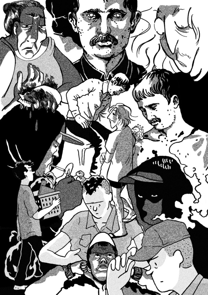 Chego à última narrativa: “O Banquete”, de Diego Sanchez. Também não esperava uma história de terror de Sanchez, mas aí pensei melhor e descobri que era óbvio que a crueldade perene e o distanciamento moral das histórias do autor em algum momento iam render uma peça tão brutal quanto essa. O desenho do camarada, apegado a pontos e linhas retas, todo contido, contrastam com a liberdade das elipses e semicurvas da Lalo. O desenho preciso, o texto solto e o absurdo em toda a história me fazem pensar que a coletânea não poderia ter escolhido uma história melhor pro seu encerramento.
