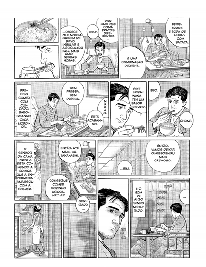 Já em O GOURMET SOLITÁRIO (Devir, 2020, tradução de Arnaldo Oka), Jiro Taniguchi e Masayuki Kusumi nos convidam a celebrar um outra forma de experienciar a temporalidade: aion é o tempo indeterminado, com início mas sem um fim determinado, uma totalidade sem bordas, uma suspensão do chronos. Flanando por bairros diversos de um Japão poliédrico, o protagonista se lança em experiências gustativas das mais diversas (e exóticas aos olhos ocidentais) em busca de saciar não só a fome, mas também um “bem-viver” expresso nas minúcias do ordinário, nos intervalos cada vez mais curtos de uma vida que nos exige a cada dia mais.