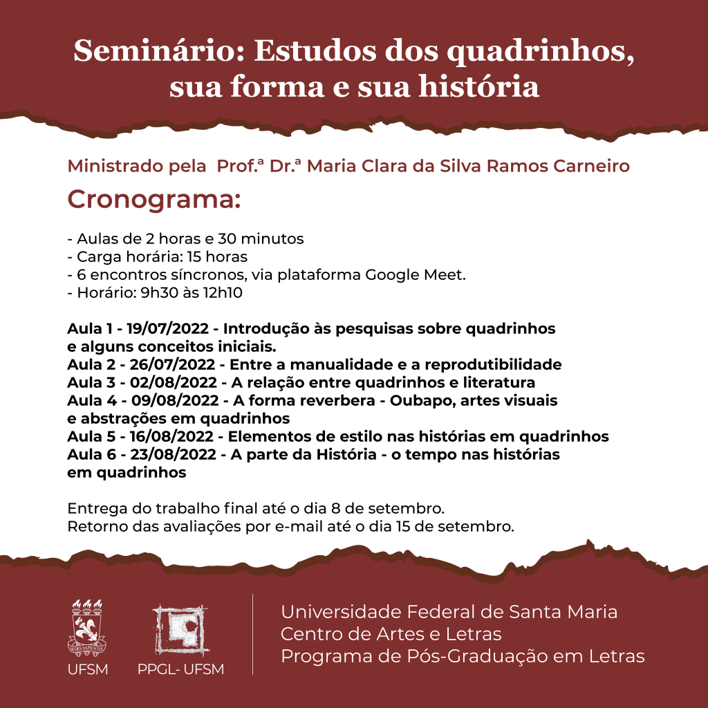 Nesta terça, começo a ministrar o Seminário “Estudos dos quadrinhos, sua forma e sua história. É um seminário para o Programa de Pós-Graduação em Letras da Universidade Federal de Santa Maria. Vou trazer um tanto da base teórica que orienta minha pesquisa, e sempre vem diluída e disseminada nos meus textos aqui do “Bartheman”.