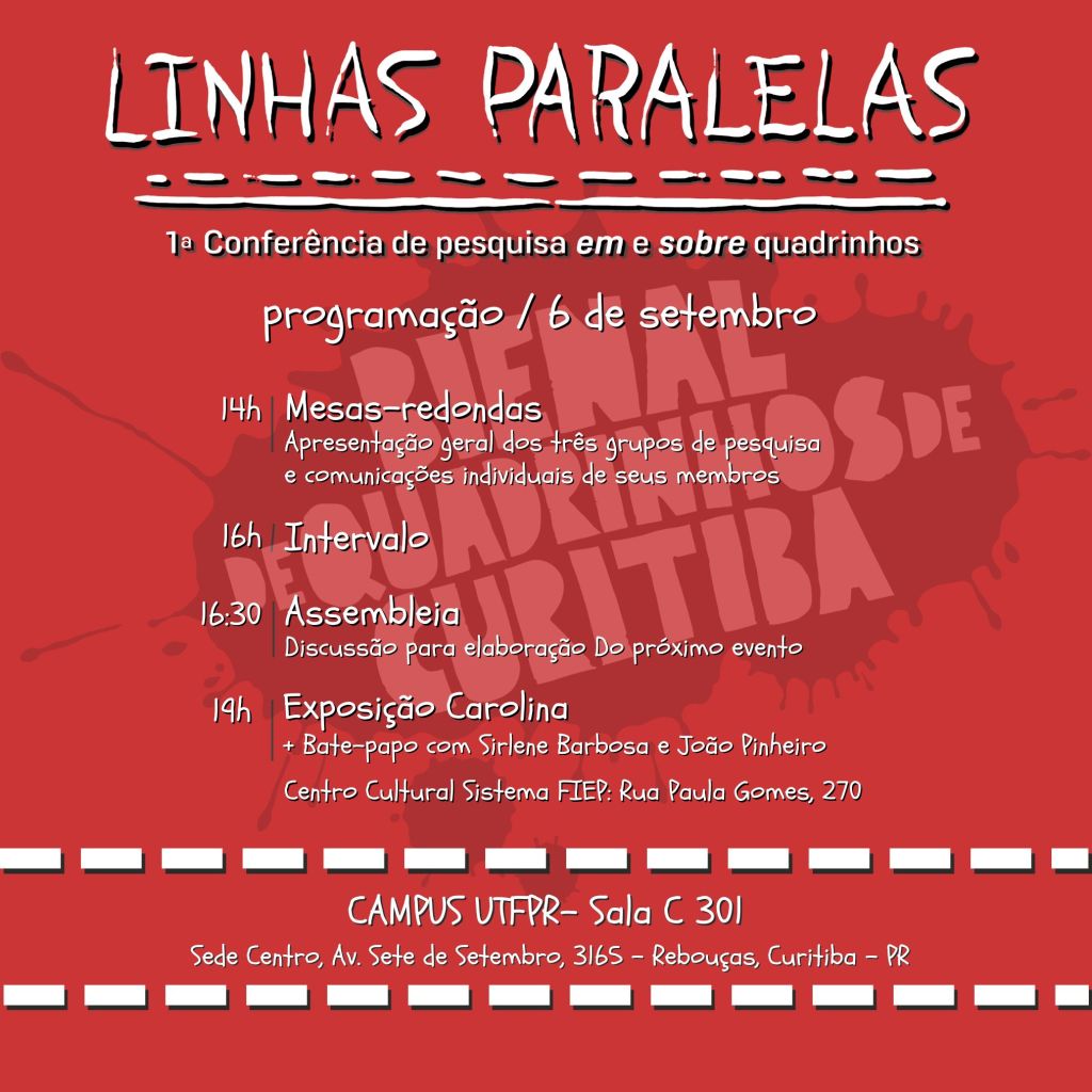 E para finalizar esse bate-bola, o nosso grupo de pesquisa GPOQT (Grupo de Pesquisa, Oficina de Escrita, Histórias em quadrinhos e Tradução) em parceria com a Bienal de Quadrinhos e com a UTFPR, estreará o seu primeiro evento acadêmico: LINHAS PARALELAS: 1ª CONFERÊNCIA DE PESQUISA EM E SOBRE QUADRINHOS.