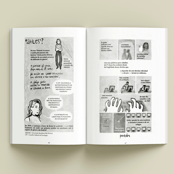 A trama é o imbróglio jurídico, médico e burocrático que a autora sofreu pra conseguir a cirurgia da remoção dos seios. Por mais que a situação esteja documentada e realmente tenha sido passada pelo CPF de Kael Vitorelo, me interessa muito mais o modo como o gibi foi elaborado do que os fios que o ligam à realidade.