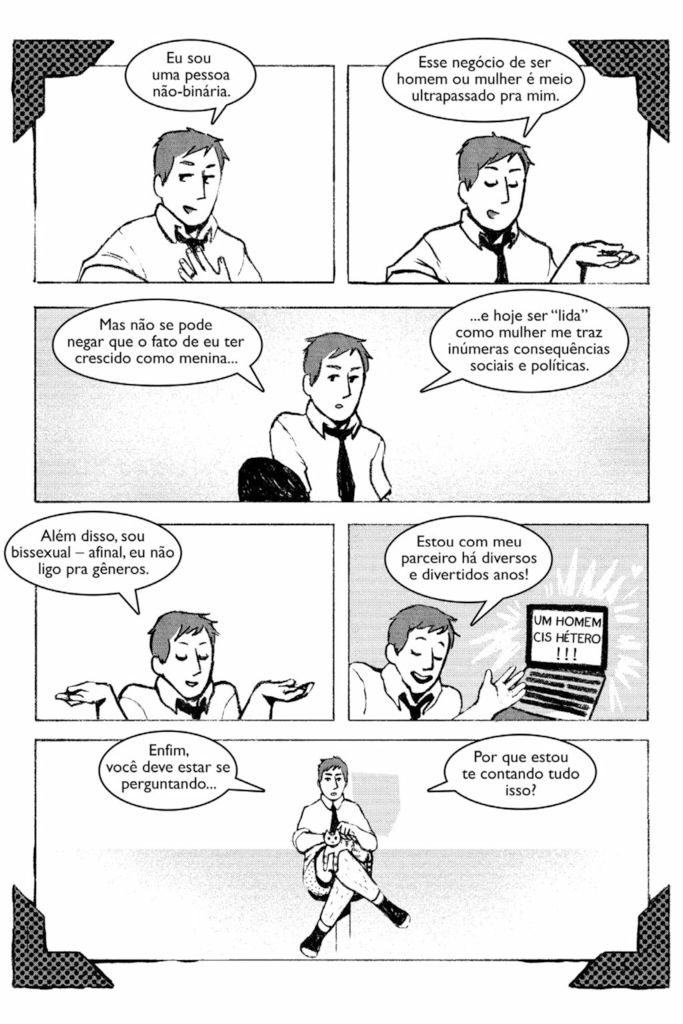 A artista, que é uma pessoa trans e não binária, tem lidado justamente com essa temática em sua obra mais recente, inclusive nos dois livros que saíram pela Veneta. Aí a gente já vê a entrada autobiográfica. É claro que Vitorelo podia tratar desses temas sem se incluir de forma explícita, mas se inclui. E aqui a narrativa ganha, porque se trata de perrengues que ela passou por ser quem é, potencializando a nossa percepção sobre a obra, no famoso efeito de “caramba, então isso é verdade?”.